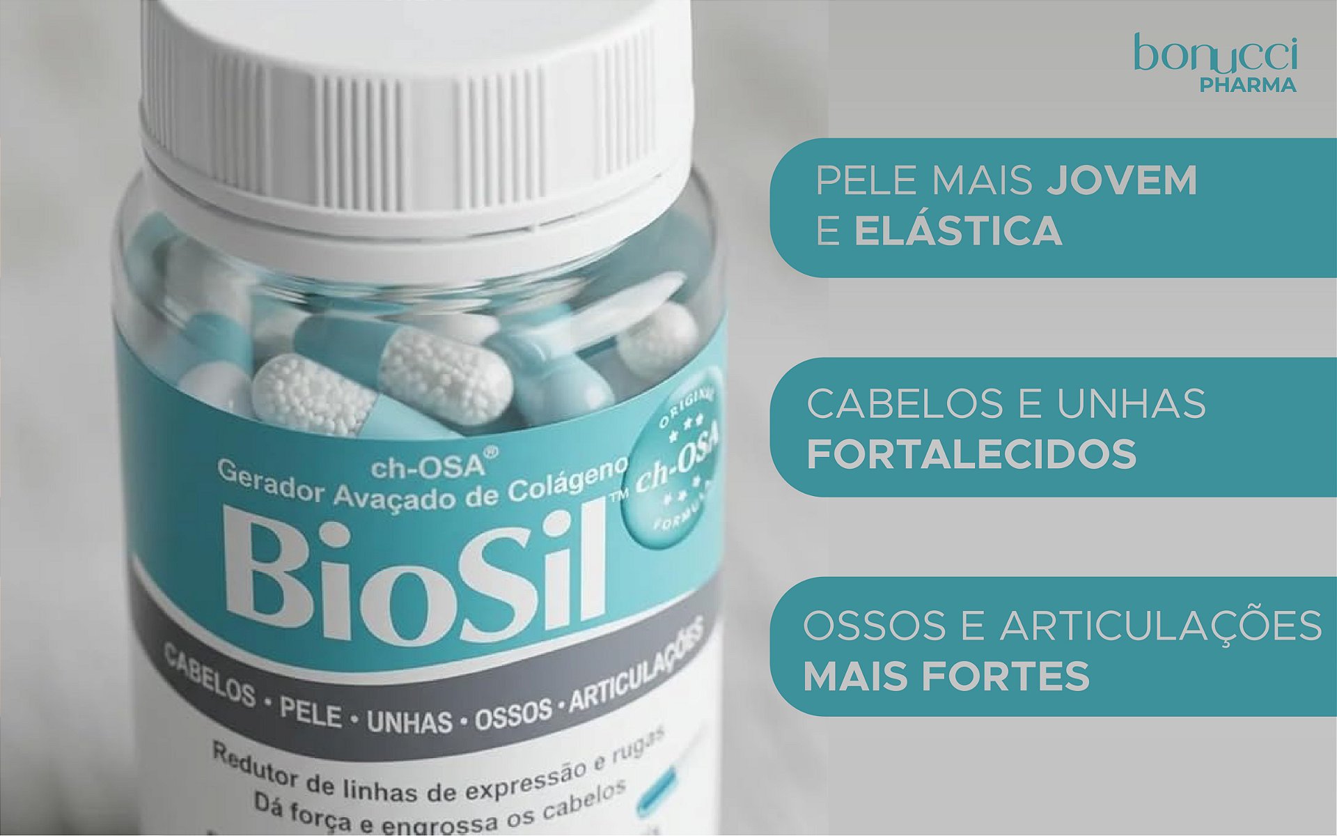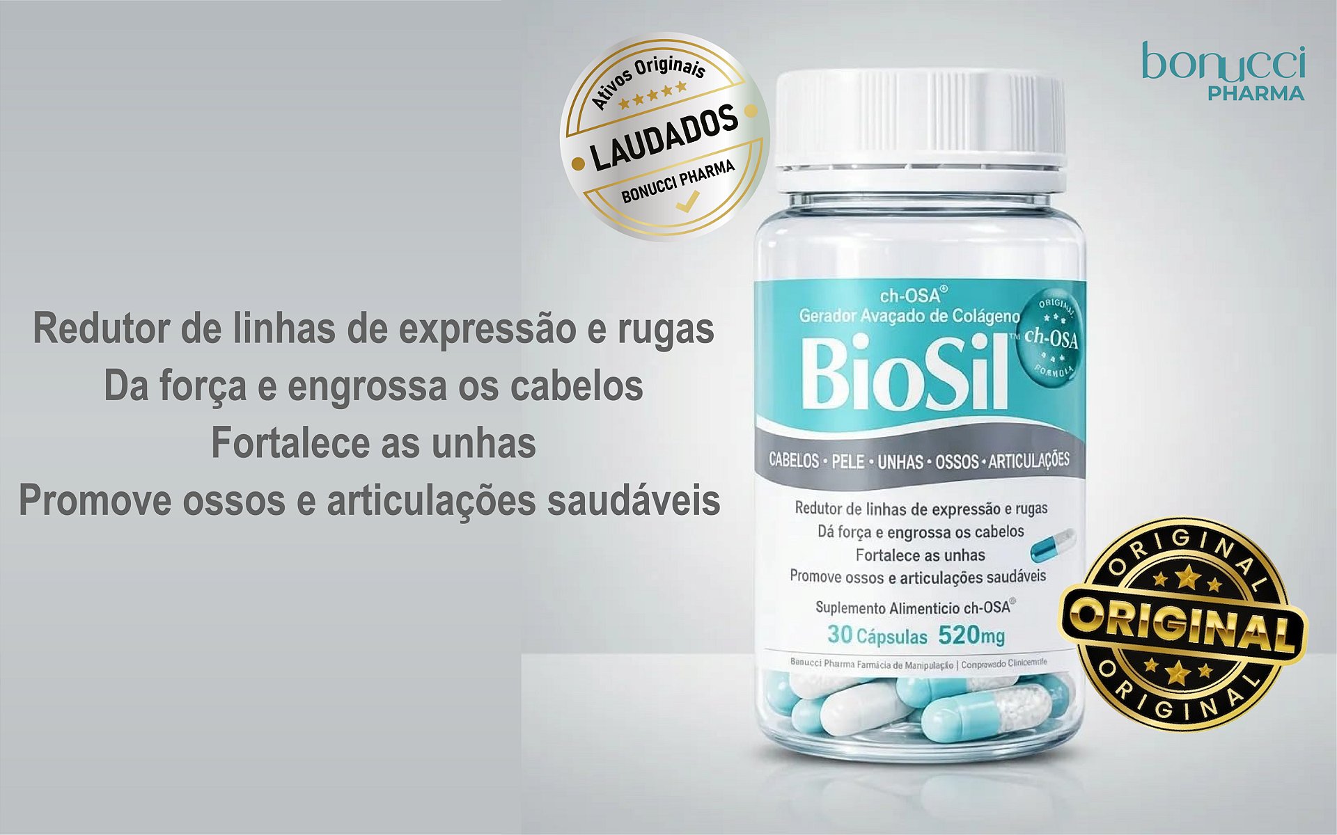 O Biosil 520mg é o ácido ortosilícico estabilizado em colina com ações benéficas, comprovadas em estudos, na saúde da pele, cabelos, unhas, ossos e articulações, através da ativação das vias de produção do colágeno. É utilizada uma tecnologia em Silício com estabilidade e biodisponibilidade garantidas para uma pele jovem e fortalecimento de cabelos e unhas.